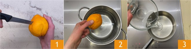 To prepare the mascarpone and orange spoon dessert, first pierce the orange with a knife 1: place it in a saucepan filled with water 2 and cook it until soft, turning it occasionally. This will take about 30-40 minutes. In the meantime, prepare the syrup: pour the water into a separate saucepan 3.