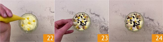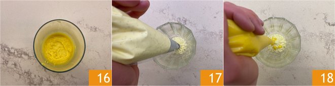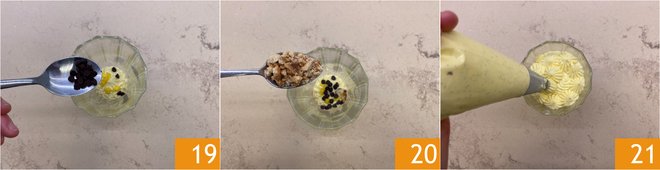 You should obtain a smooth cream 16; if it turns out too thick, add some of the cooking water. Now take a dessert glass with a capacity of 8 oz and pipe a layer of mascarpone cream using a piping bag with a star tip 17. Using a piping bag without a tip and with a small hole, add dots of orange cream as desired 18.