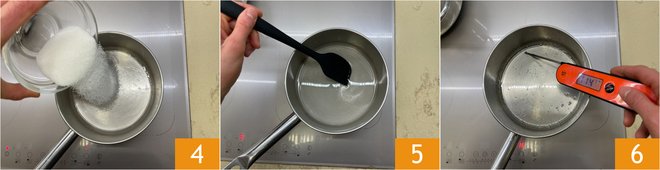 Add the sugar 4, stir 5, and bring the syrup to a temperature of 237°F-239°F, monitoring it with a kitchen thermometer 6.