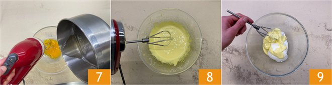 When the syrup reaches 219°F, place the egg yolks in a bowl and start beating them with an electric whisk. Once it reaches temperature, pour the syrup in a thin stream while keeping the whisk running 7. Continue whisking until you get a light and fluffy mixture 8. Add a spoonful of the mixture to the mascarpone, which you have placed in a bowl, and stir to temper it 9.