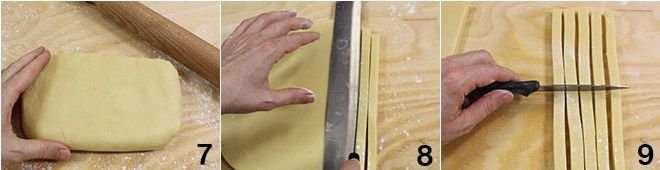 After the necessary time has passed, take the pastry out of the refrigerator and start composing the matchstick cookies: to get a shape as precise as possible, the dough must be very cold, so we recommend dividing it into two parts and starting to work with one, putting the other back in the refrigerator. Roll out the pastry with a rolling pin to a thickness of about 3/8 inch 7, then cut it into strips about 8 inches long and 3/8 inch wide 8 and cut them in half to obtain sticks about 4 inches long 9.