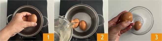 To prepare mayonnaise with hard-boiled eggs, start by cooking the eggs. Place the eggs in a small pot 1 and cover them with plenty of water, put the pot on the stove, bring to a boil and cook the eggs for 9 minutes, counting the time from when it starts boiling 2. After the cooking time has passed, let the eggs cool at room temperature or, to speed it up, under running water. Gently tap the eggs to crack the shell 3.