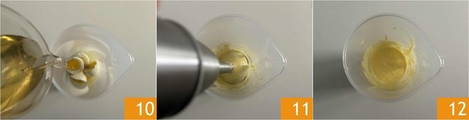 Add the vegetable oil 10, then blend everything with the immersion blender 11 until you get a fluffy, soft, and uniform mixture 12.