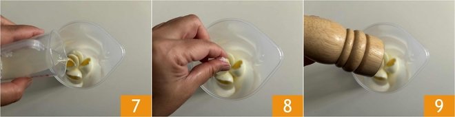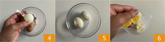At this point, gently remove the shell 4 from both eggs 5 and cut them in half 6.