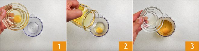 To prepare the mayonnaise with an immersion blender, we recommend chilling the part of the immersion blender with the blades and the oil, along with the lemon juice, a couple of hours beforehand. Take the egg directly from the fridge. Pour the ingredients into a tall glass in this order: the egg (making sure not to break the yolk) 1, the seed oil 2, the lemon juice 3, and a pinch of salt.