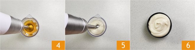 At this point, submerge the immersion blender blades to the bottom of the glass 4. Then turn on the blender, keeping it still until the mayonnaise begins to thicken 5. At this point, move the immersion blender with up-and-down movements until the mixture is smooth and well-mixed. These steps will take only a few seconds. Pour the ready mayonnaise into a jar with a lid or a small bowl 6, covering it with plastic wrap to prevent a skin from forming on the surface. The mayonnaise with an immersion blender is ready for use!