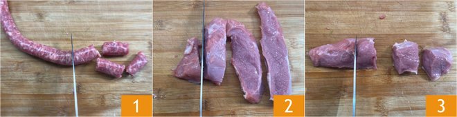 To prepare the meat skewers, first remove the casing from the sausage and cut it into pieces about 1 1/4 inches 1. Cut the veal meat into slices first 2 and then into cubes with 1 1/4-inch sides 3.