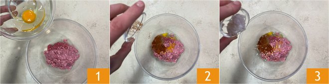 To prepare the meatballs with cannellini cream, place the ground beef and pork in a bowl, then add the egg 1, the spices 2, the minced shallot, and garlic 3.