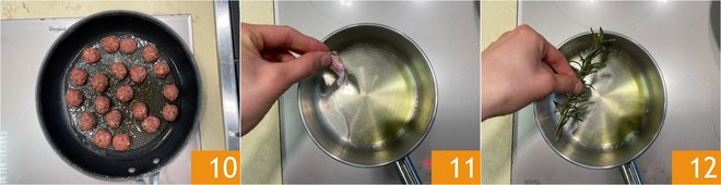Cook the meatballs 10 until golden, turning them occasionally, it will take about 10 minutes. Meanwhile, prepare the cannellini cream: in a pot, heat a drizzle of oil with the crushed garlic in its skin 11 and rosemary 12.