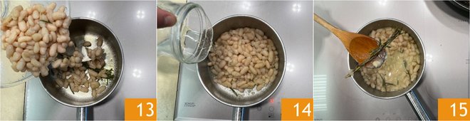 As soon as the oil is lukewarm, add the cannellini beans you have previously rinsed 13. Sauté them briefly, then pour in some water 14 and cook for about ten minutes, just enough time to flavor them. At the end of cooking, remove the garlic and rosemary 15.