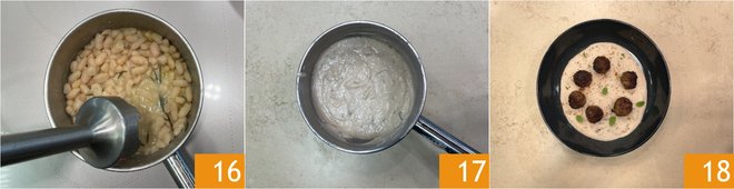 Blend with an immersion blender 16 to obtain a creamy consistency 17. Quickly pass the meatballs over some paper towels to remove the excess oil, then place them on the cannellini cream. Garnish with a pinch of coriander, paprika, and a few mint leaves: your meatballs with cannellini cream are ready to be served 18!