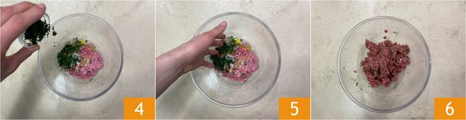 Add chopped parsley and mint as well 4. Knead with your hands 5 to combine the mixture 6, then adjust the salt.