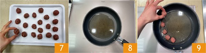 Form walnut-sized meatballs and transfer them to a tray 7. Heat the oil in a pan 8 and place the meatballs inside 9.