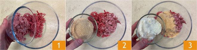 To prepare the meatballs with cheddar and bacon, place the minced beef and pork in a bowl 1, then add the breadcrumbs 2 and grated Parmigiano Reggiano 3.