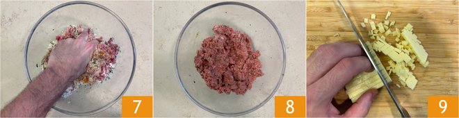 Knead with your hands to combine the ingredients 7 and obtain a homogeneous mixture 8. Now cut the cheddar into very small cubes 9.