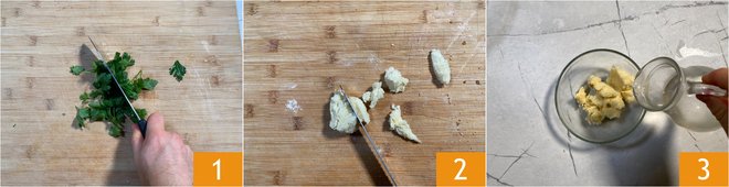To prepare the meatballs in sauce, first chop the parsley 1 and set it aside. Then cut the bread into pieces 2 and place it in a bowl with water 3.