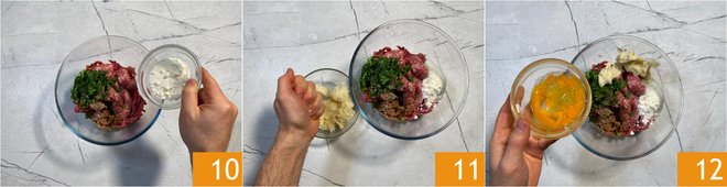 Also add the grated Parmesan 10, the well-squeezed bread 11, and the beaten egg 12.