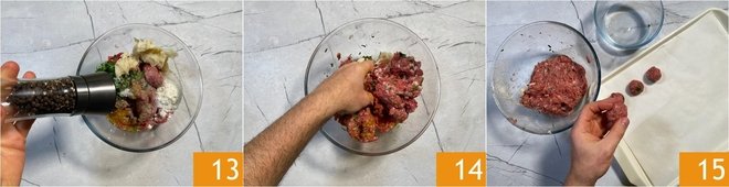 Add salt and pepper 13. Knead for a few minutes 14 until you get a homogeneous mixture. Then form the meatballs by taking about 20 g (approximately 0.7 oz) of dough with wet hands and shaping them into balls 15.