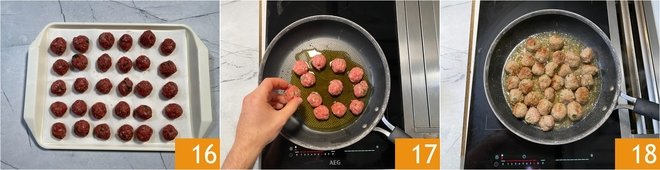 You will get about 24 meatballs 16. Pour the meatballs into a pan with a drizzle of hot oil 17 and brown them on all sides over high heat, turning the pan 18 to avoid breaking the meatballs.