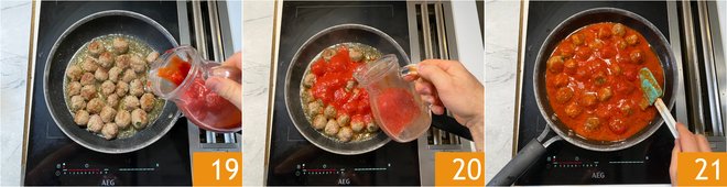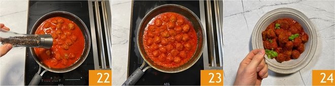 Salt and pepper 21 to taste, then cook the meatballs for about twenty minutes over medium-low heat 23. Plate and serve with basil leaves 24.