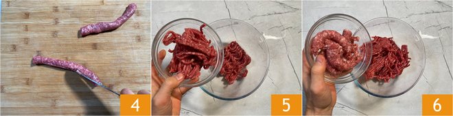 Let the bread soak and meanwhile, remove the casing from the sausage 4. In a bowl, pour the ground beef 5 and the sausage in pieces 6.