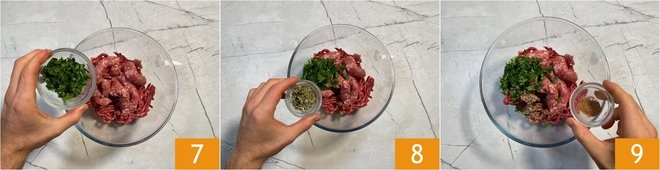 Add the herbs: parsley 7, oregano 8, and nutmeg 9.