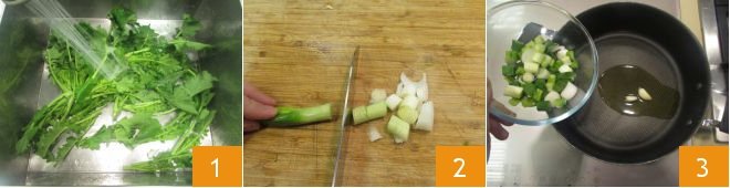 To make turnip green meatballs, first wash the greens under running water 1. Clean and slice the scallion 2. In a pot, heat the oil and garlic, add the scallion, and sauté for one minute 3.