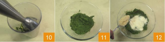 Blend the greens with an immersion blender 10 to create a puree 11. At this point, transfer the blended greens to a large bowl and add the breadcrumbs and grated cheese 12, then mix.