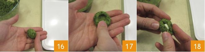 Take a portion of mixture weighing about 0.7 oz, form a ball with your hands 16, create a cavity with your finger 17, and fill with a cube of Taleggio 18.