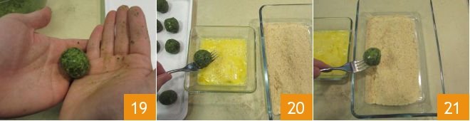 Close the meatball by rolling it between your hands 19. Prepare the breading: in a small bowl, beat the eggs with a pinch of salt and pour the breadcrumbs into another. Meanwhile, heat the oil for frying in a pot to a temperature of 330°F. Dip the meatballs first in the beaten egg 20 and then in the breadcrumbs 21.