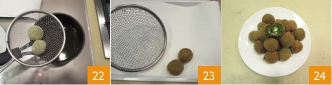 Fry a few meatballs at a time 22 for 2 minutes or until golden brown. Then drain them on a tray lined with absorbent paper 23. Serve the turnip green meatballs piping hot 24.