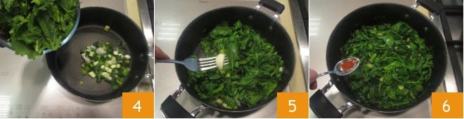 Add the cleaned greens 4, remove the garlic 5, and season with chili pepper 6 and salt.