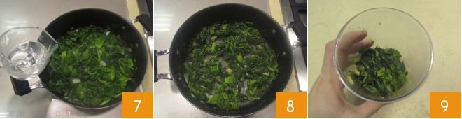 Add the water 7 and continue cooking: the greens will cook for about 10 minutes in total. When the greens are cooked 8, transfer them to a tall and narrow glass 9.