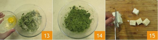 Incorporate the egg 13 and mix again to create a homogeneous mixture 14. In the meantime, cut the Taleggio into cubes 15.