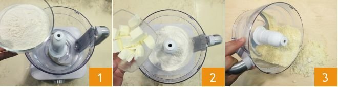 To make the meatloaf in a loaf pan, start by preparing the Easy Shortcrust Pastry. Put the flour 1, cold butter pieces from the fridge 2, a pinch of salt, and blend everything until you get a sandy, floury texture. At this point, place the mixture on a pastry board 3.