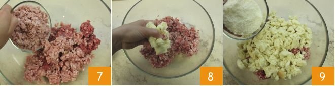 Now, focus on the meatloaf mixture: in a large bowl, combine the beef, diced bacon, mortadella 7, bread pieces 8, grated pecorino cheese 9,