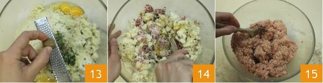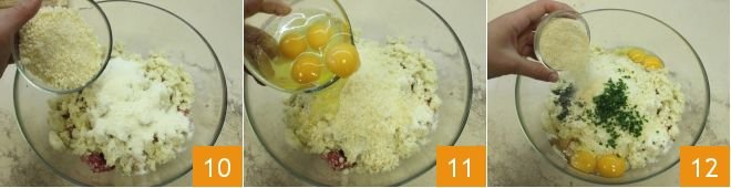 also grated Parmesan cheese 10, 4 whole eggs 11, and a crushed garlic clove. Add breadcrumbs 12, flavor with chopped parsley and marjoram,