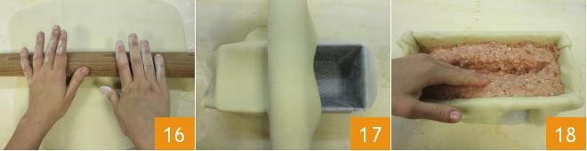 Now take the shortcrust pastry, roll it out into a thin rectangular sheet 16. Butter the mold, line it with parchment paper, leaving side flaps to easily lift the meatloaf from the mold, and line the inside with the shortcrust pastry. Use the rolling pin to place the sheet 17 and place the meatloaf inside, create a central groove along the length 18