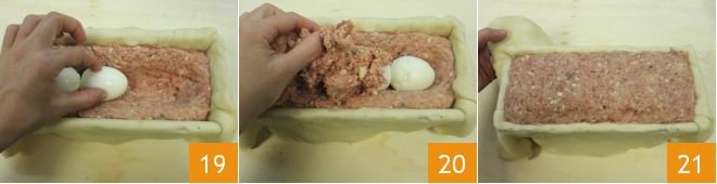 and place the 4 boiled eggs inside 19. Cover the surface with more mixture 20 and close with the excess shortcrust pastry from the edge 21,