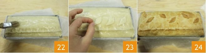trim off the excess dough and pinch the edges to seal the pastry well. Beat the egg with a tablespoon of milk and brush the meatloaf so that the pastry is golden and crispy 22. With the leftover dough, you can create leaves to apply on the surface 23. Now proceed with baking: bake in a preheated static oven at 320°F for 60 minutes. Once baked, remove the meatloaf from the loaf pan, let it cool slightly 24 and then unmold it by lifting with the parchment paper flaps. Serve the meatloaf in slices and accompany it with mixed vegetable sides or roasted potatoes.