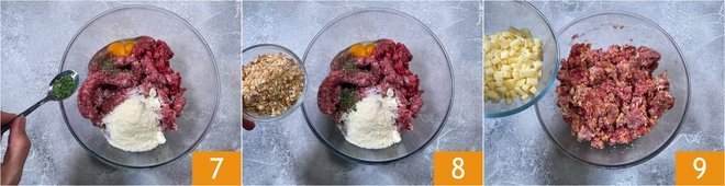 Flavor with dried chives 7 and finally add the rustic breadcrumbs 8. Mix with your hands to combine the ingredients, then add the cubed Gruyère 9.