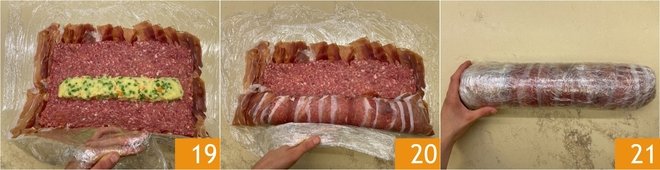 At this point, spread out rectangles of plastic wrap on the work surface, slightly overlapping them to create a larger rectangle, then place the slices of speck on top, slightly overlapping 16. Spread the meat mixture over the entire surface to obtain a rectangle of about 16x11 inches, with a thickness of 3/8 inch, making sure to leave the edges free 17. Finally, distribute the potato mixture in the center of the rectangle, transversely to the direction of the speck slices 18, and shape it with your hands to form a cylinder.