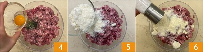 Add the egg 4 and the grated Parmigiano Reggiano DOP 5, then salt 6.