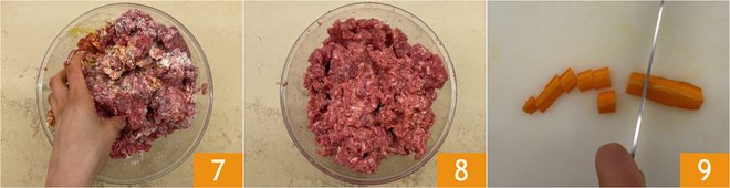 Mix everything with your hands 7 until you get a homogeneous mixture 8. Cover with plastic wrap and set aside for a moment. Now focus on the filling: peel and cut the carrot into 3/8 inch cubes 9.
