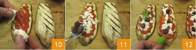 When the tomato sauce is ready, remove the garlic clove 7. Tear the mozzarella into pieces with your hands 8 and preheat the oven to 356°F in static mode. Now you're ready to assemble the rolls: spread a layer of tomato sauce on the surface of the eggplants 9,