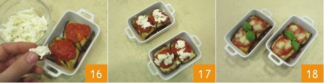 Roll up the eggplants with their filling 13 and place them in a small baking dish with the seam side down 14. Finally, cover the rolls with a bit of tomato sauce 15