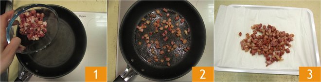 To prepare the melon and bacon cups, first heat a non-stick pan, add the bacon 1 and let it brown until golden 2. Transfer the bacon to a tray lined with paper towels 3 to absorb the excess fat.