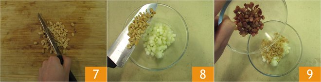 Roughly chop the peanuts with a knife 7. In a large bowl, pour in the melon, peanuts 8, and bacon 9.