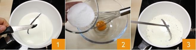 To prepare meringue coffee, start by making the custard: heat the milk in a saucepan with half a vanilla bean and its seeds 1. Whisk the egg yolk and sugar in a bowl 2, then add the flour. Use tongs to remove the bean 3 and