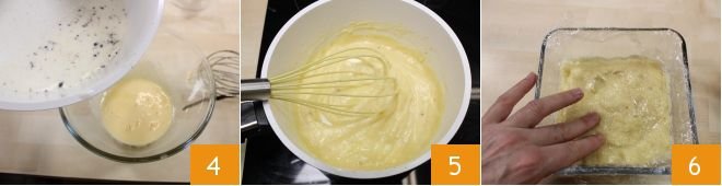 pour the warmed milk into the mixture slowly 4, blending with the whisk. Return the mixture to the heat and stir continuously until the custard has thickened 5. Transfer the custard to a bowl and let it cool, covering it with a sheet of plastic wrap in contact with the surface 6.